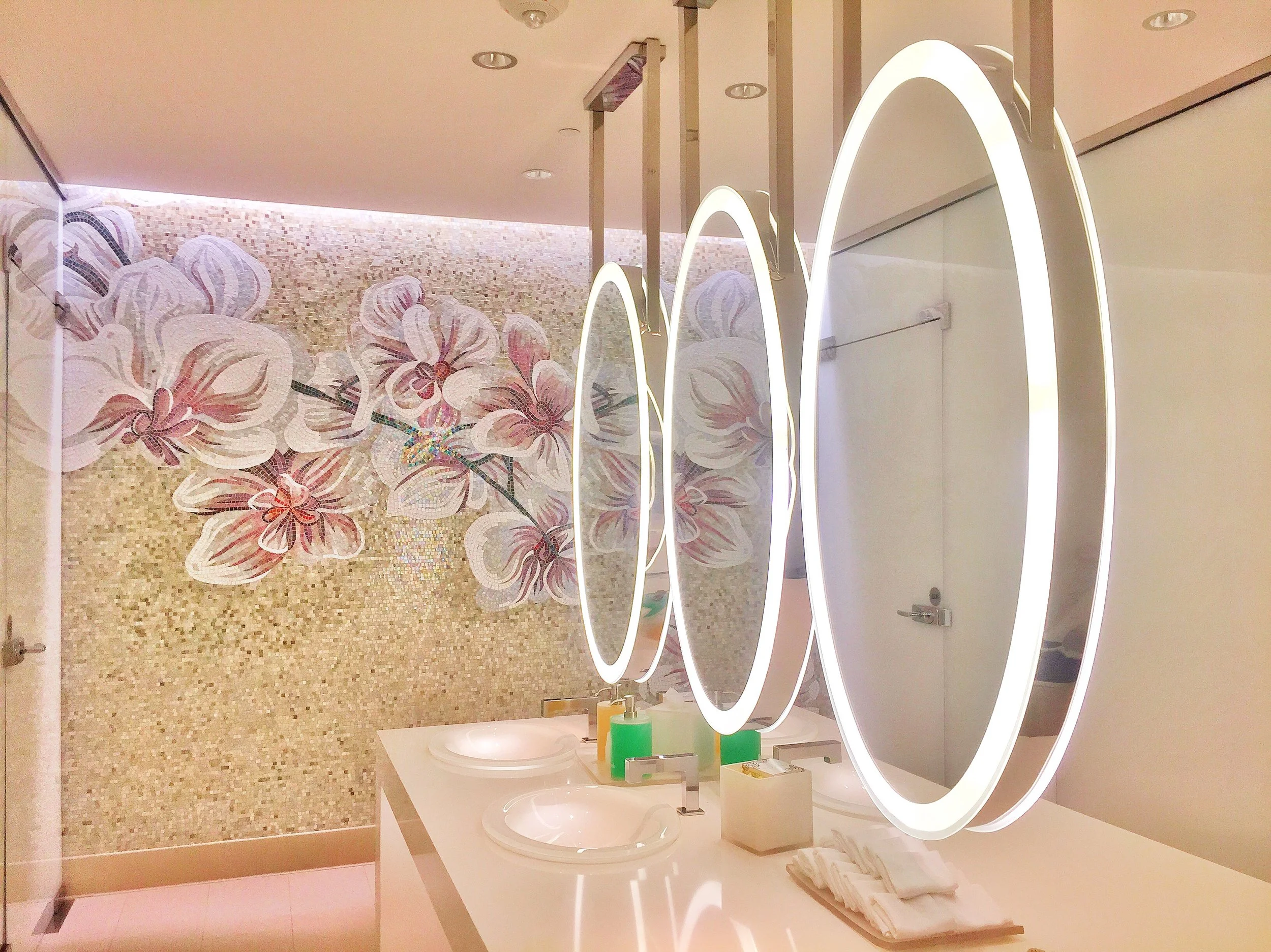 The women’s restroom is decorated with a lovely floral mosaic wall and ring light mirrors mounted to the ceiling. These ring light mirrors are the perfect mirrors to look into and make you feel beautiful every time.