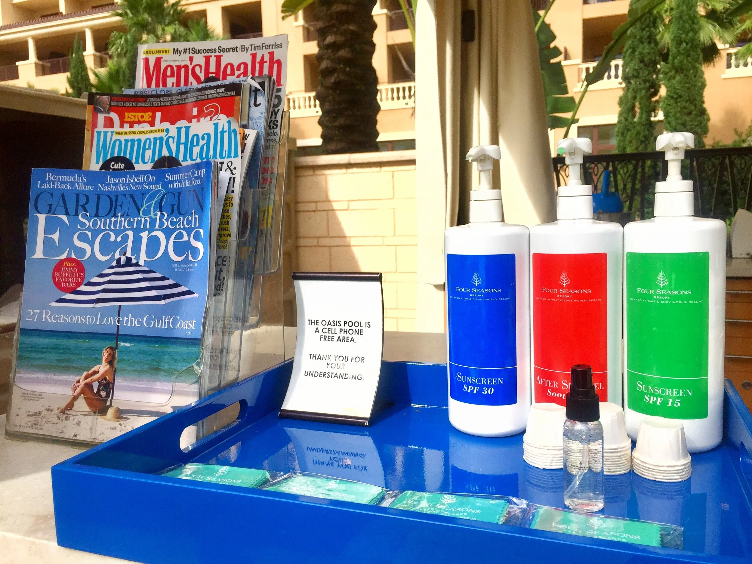 - Four Seasons guest service at the pools, with ample seating including loungers and daybeds, plus complimentary umbrellas for shade, complimentary poolside amenities, and poolside cocktail service available