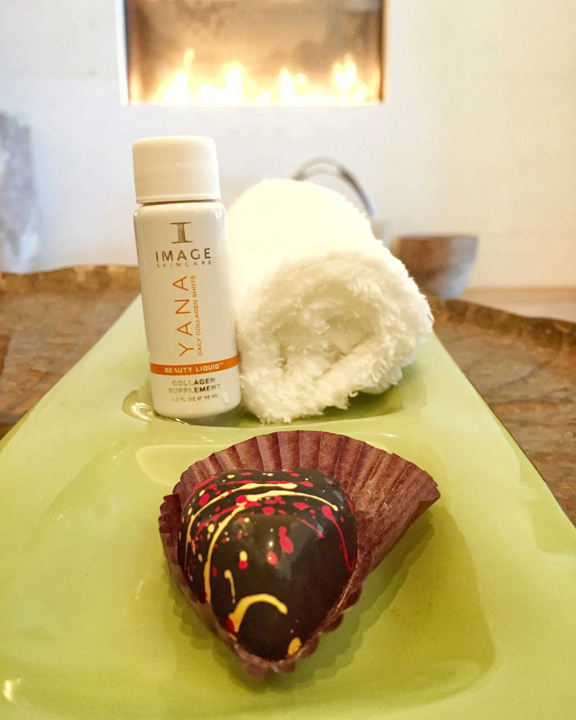 Post-treatment goodies. Yana Daily Collagen Shot & Norman Love’s Hot Dark Chocolate - intense dark chocolate infused with jalapeño pepper for a delightfully spicy sweet combination.
